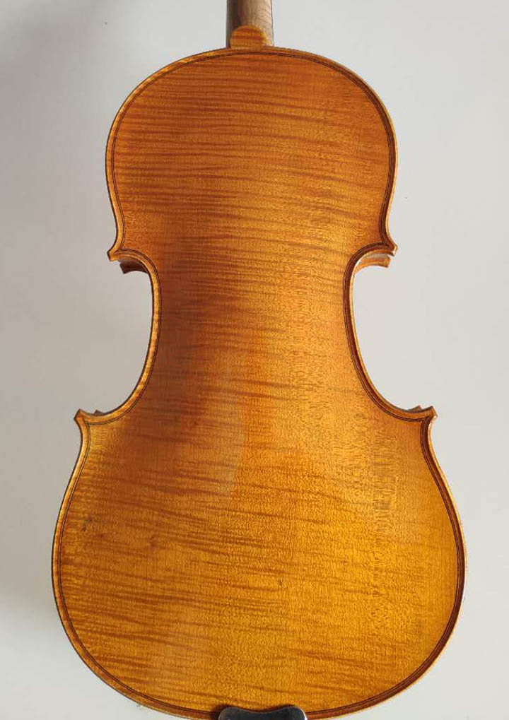 描述:正如大家所看到的的一樣,這把琴有著非常美觀的外形,這取決于它的選材和油漆,背板的花紋看上去非常的自然和諧,面板木紋之間的距離都在2毫米左右;采用亮光的酒精漆,防舊復古的風格更是賦予了這把琴以神秘感。這把琴雖然看上去很硬,但聲音確是非常的柔美,堪稱是一把非常不錯的演奏級小提琴。